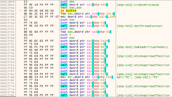 CreateProcess()with theCREATE_SUSPENDED (0x00000004)flag - Unmapping the sections with