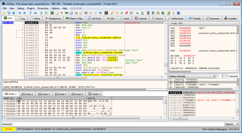 Introducing x64dbg and Pizzacrypts Ransomware Unpacking